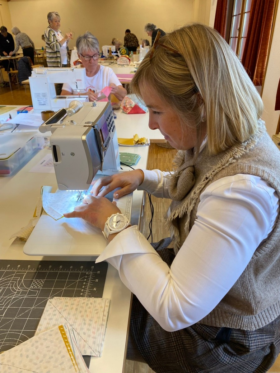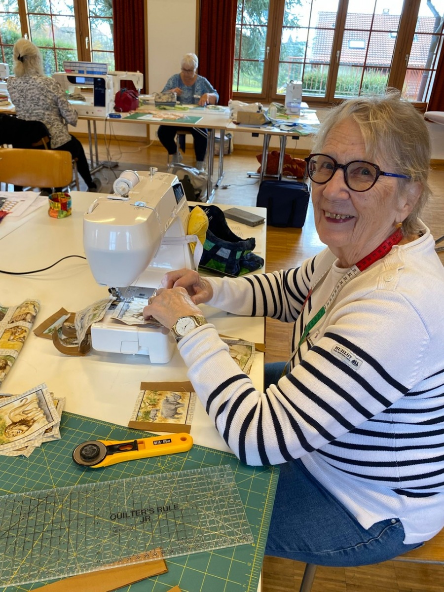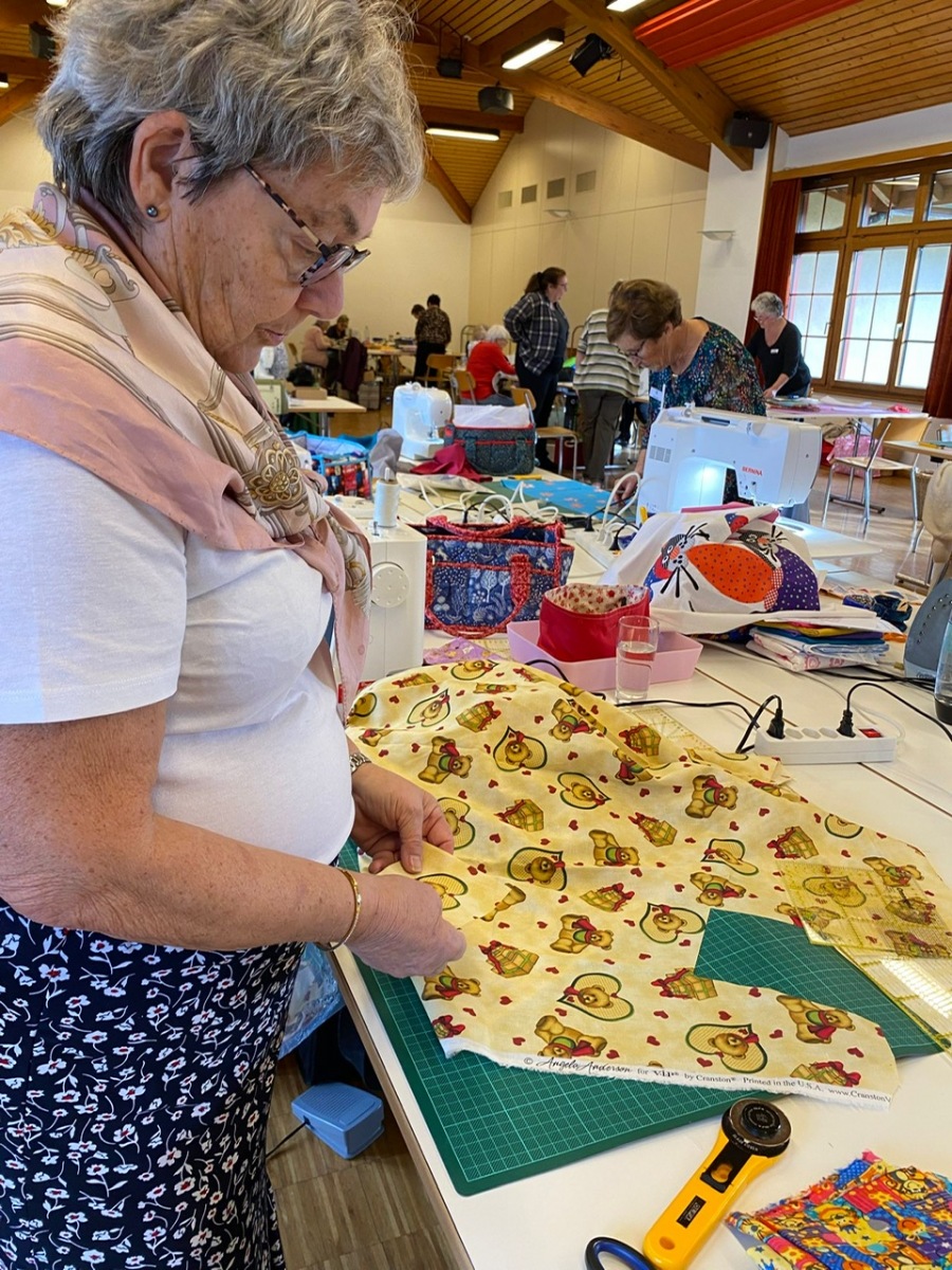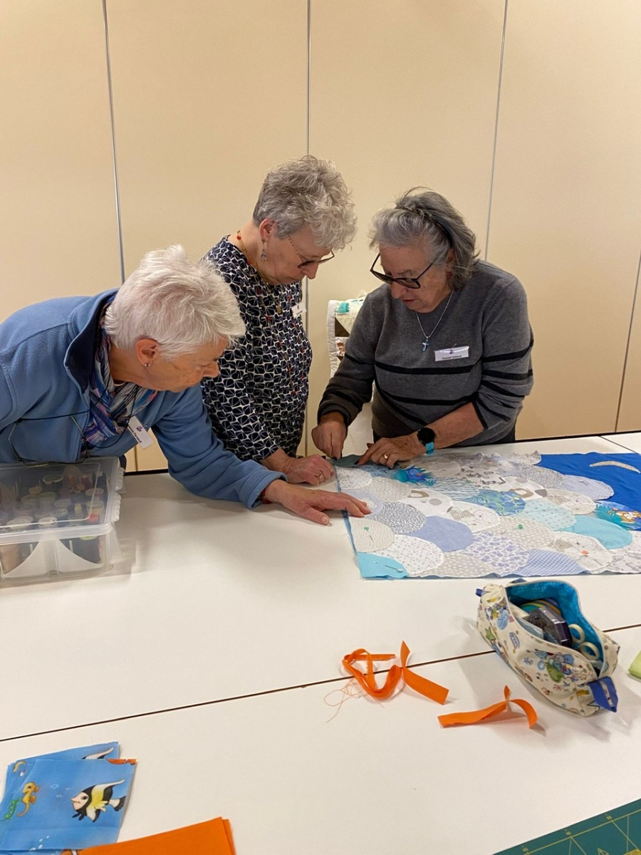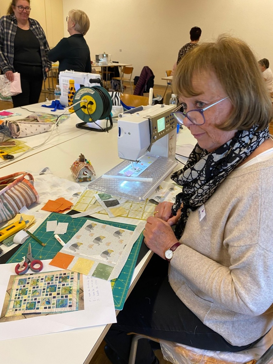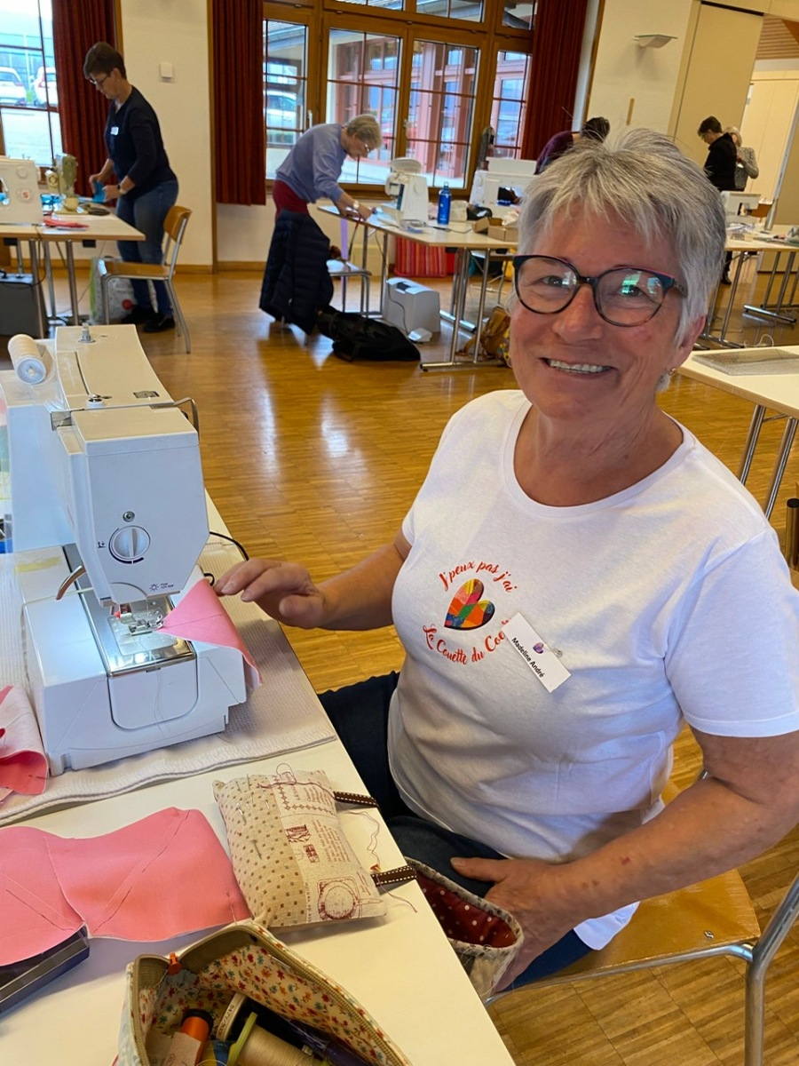 Hier, samedi 15 novembre, a eu lieu notre rencontre pour la confection des Couettes du Coeur. Nous avons passé une très bonne journée, avec une belle ambiance. Comme à leur habitude, Marianne Margot et son Maillon nous ont reçues comme des reines. Tresse et petits pots de confiture ou chocolat avec un excellent café. Pour l’apéro, plats de fromage et viande froide avec un excellent vin de la région. Le nouveau modèle a fait sensation. Les couturières présentes l’ont bien apprécié et plusieurs d’entre elles l’ont exécuté avec succès. Merci à Thierry pour la marche à suivre, elle était parfaite. Corinne Vaucher nous a gâtées avec sa jolie trousse garnie de tissus. Les dames l’ont bien aimé et le Maillon de Fribourg fera même un défi avec ce beau tissu ! On se réjouit déjà d’en admirer le résultat. Merci à toutes pour votre présence et votre bonne humeur !
